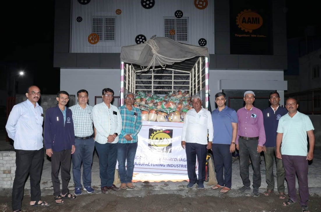 राज्यभरात मुसळधार पावसाने धुमाकूळ घातला असून अनेक गावांमध्ये पूरस्थिती निर्माण झाली आहे. घरात पाणी शिरल्याने संसार उघड्यावर पडले आहेत तर शेतकऱ्यांच्या उभ्या पिकांचे प्रचंड नुकसान झाले आहे. या भीषण परिस्थितीत पूरग्रस्तांना दिलासा देण्यासाठी नगर एम.आय.डी.सी. येथील आमी संघटनेचे उद्योजक मदतीसाठी पुढे सरसावले आहेत.