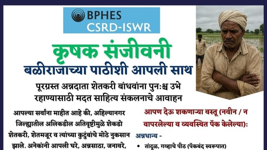 मदतकार्य व समुपदेशनासाठी ‘डी-स्ट्रेस हेल्पलाईन’ कार्यान्वित – साहित्य संकलनाचे आवाहन   अहिल्यानगर | प्रतिनिधी अतिवृष्टीमुळे अहिल्यानगर जिल्ह्यातील शेकडो शेतकरी, शेतमजूर व त्यांच्या कुटुंबांचे मोठे नुकसान झाले आहे. अनेकांच्या घरांची छप्परे उडाली, धान्यसाठे वाहून गेले, जनावरांची जीवितहानी झाली, विद्यार्थ्यांचे शैक्षणिक साहित्य व दैनंदिन जगण्याच्या वस्तू पाण्याबरोबर वाहून गेल्या. या संकटात अन्नदाता शेतकरी बांधव अक्षरशः हतबल झाले…